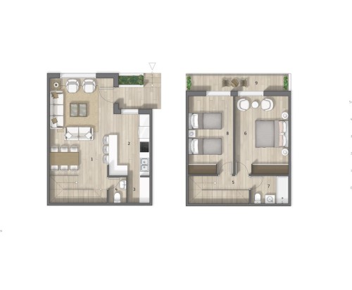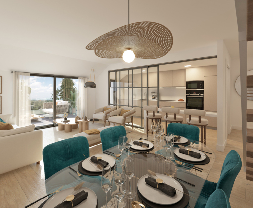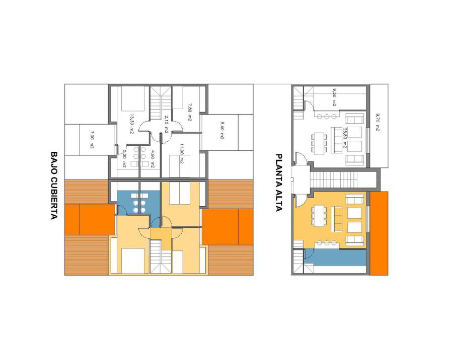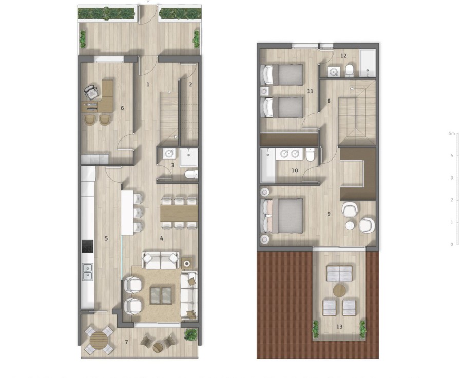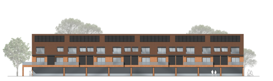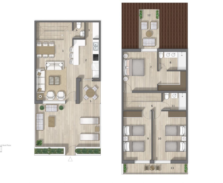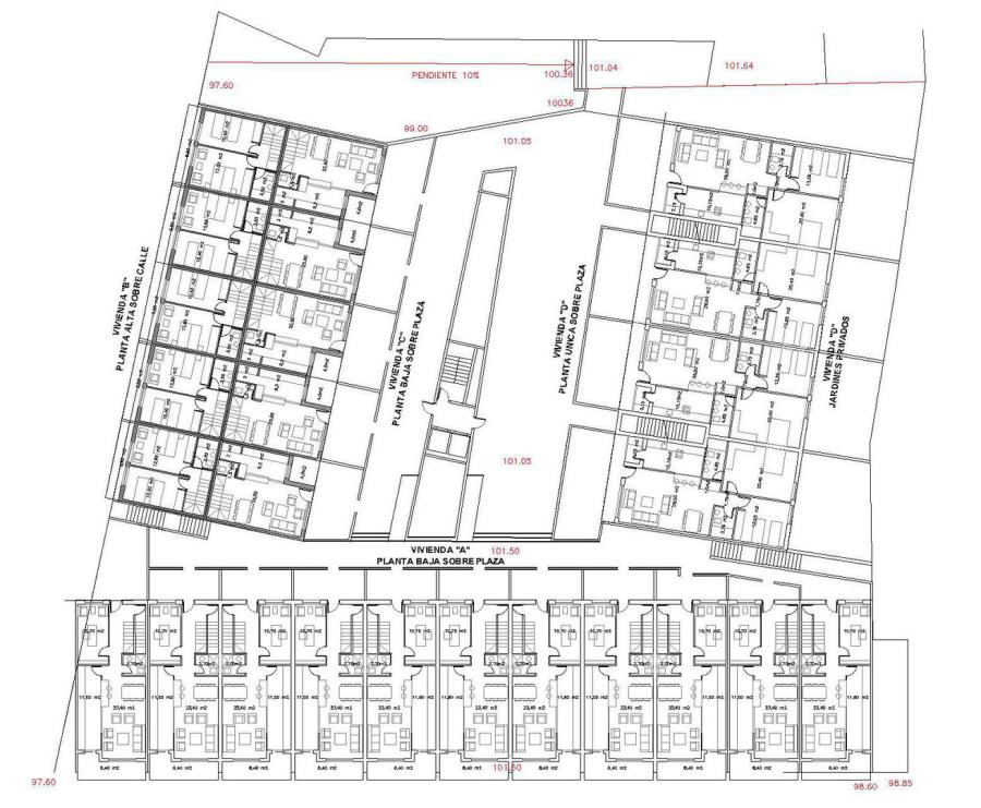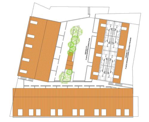 Diseño arquitectónico: Las viviendas, de tipo dúplex asimilables a chalets adosados, con acceso desde la plaza, están diseñadas con un enfoque moderno y funcional. Incluyen cocinas semiabiertas al salón, una distribución con salones y habitaciones de amplias dimensiones en las que se prevé la posibilidad de disponer de despacho de trabajo, trasteros, etc., en propuesta ideal para familias modernas, y cuentan con porches ajardinados frente a las entradas, que proporcionan privacidad frente a la plaza pública arbolada y de acceso restringido.